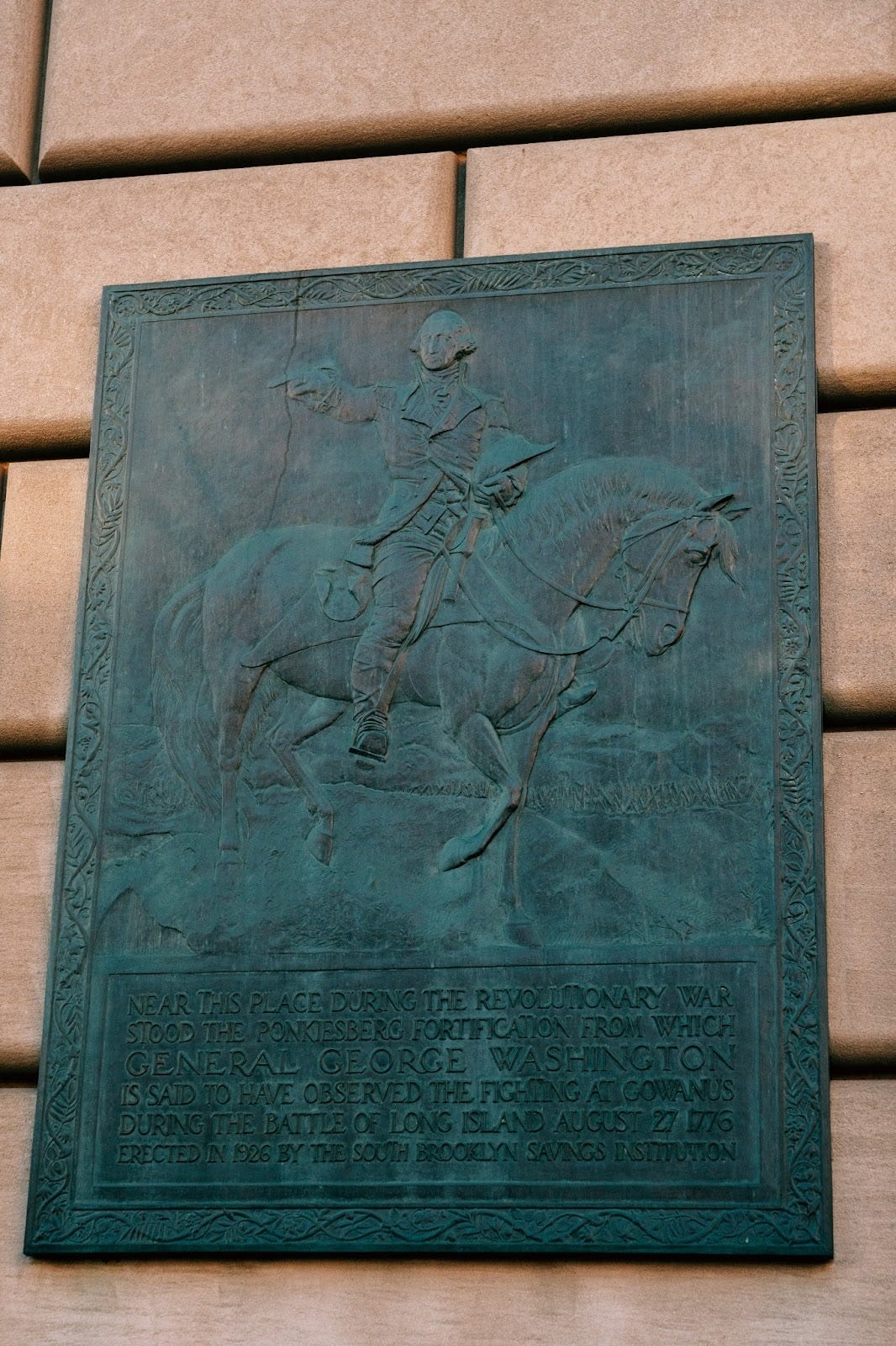 “Near this place during the Revolutionary War stood the Ponkiesberg Fortification from which General George Washington is said to have observed the fighting at Gowanus during The Battle of Long Island August 27, 1776.”