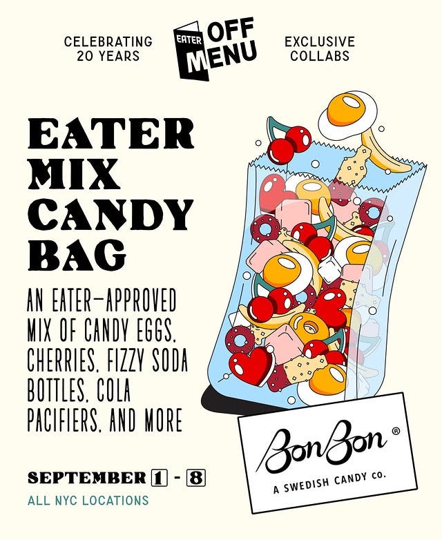 Exclusive Eater Mix Candy Bag Collab @ BonBon (all locations, including Red Hook 66 Degraw St): For their 20th birthday, Eater is running a special collaboration with BonBon featuring an exclusive mix of their favorite food-themed gummies. Party mixes will be available September 1-8.
