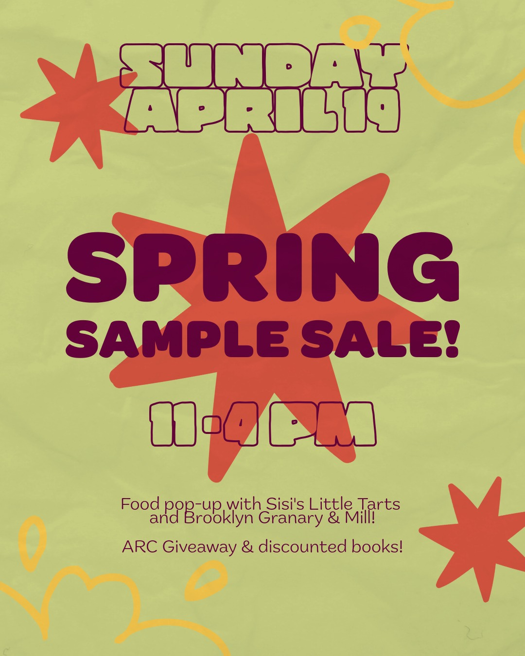 Spring Sample Sale @ Liz’s Book Bar (11:00am-4:00pm)*: Enjoy a full day of discounted books, an ARC giveaway, and a lively neighborhood atmosphere. Browse and stick around for a food pop-up from Sisi’s Little Tarts and the Brooklyn Granary & Mill.
