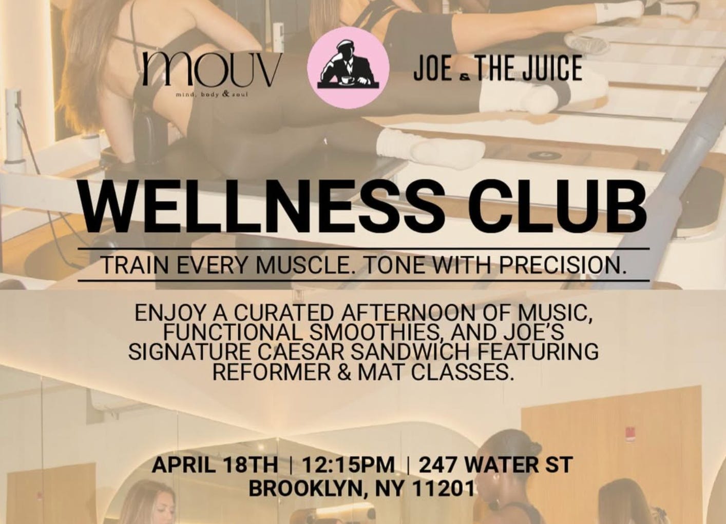 MOUV x Joe & The Juice Wellness Club (12:15pm)*: MOUV is teaming up with Joe & The Juice for a Wellness Club event featuring reformer and mat classes alongside music, smoothies, and light bites. Expect a curated afternoon blending movement, community, and recovery. Save your spot HERE.