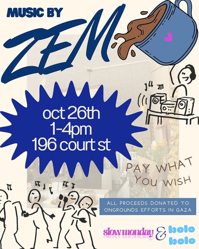 Slow Monday Popup @ Bolo Bolo (1:00pm-4:00pm): Check out this café pop-up with @brookegizem. There will be music and pastries. No tickets required, all proceeds will go towards on-ground efforts in Gaza.