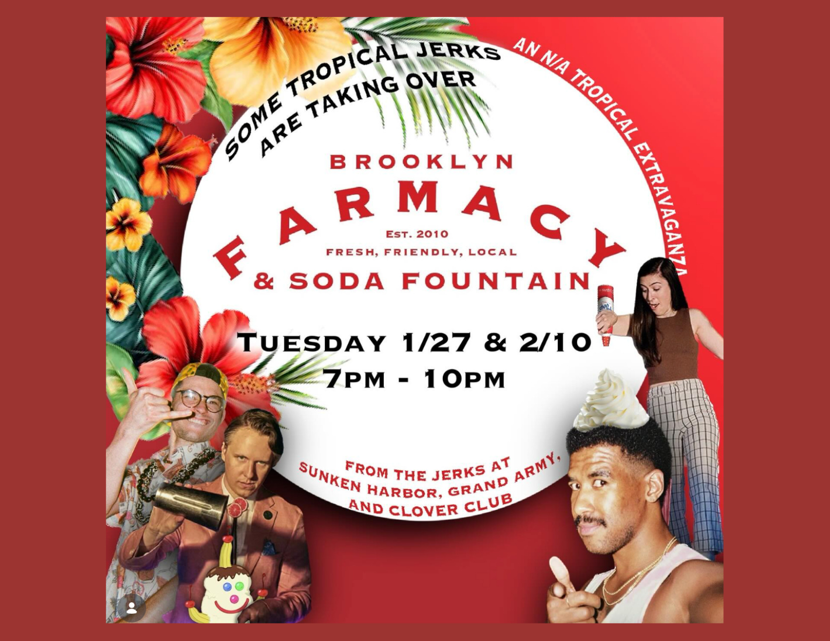 Tropical Takeover @ Brooklyn Farmacy (7:00pm-10:00pm): A tropical soda bash is closing out Dry January with non-alcoholic sodas and floats, hosted by the team behind Gage & Tollner, Sunken Harbor Club, Clover Club, and Grand Army. The pop-up offers a playful, tropical send-off to Dry January.