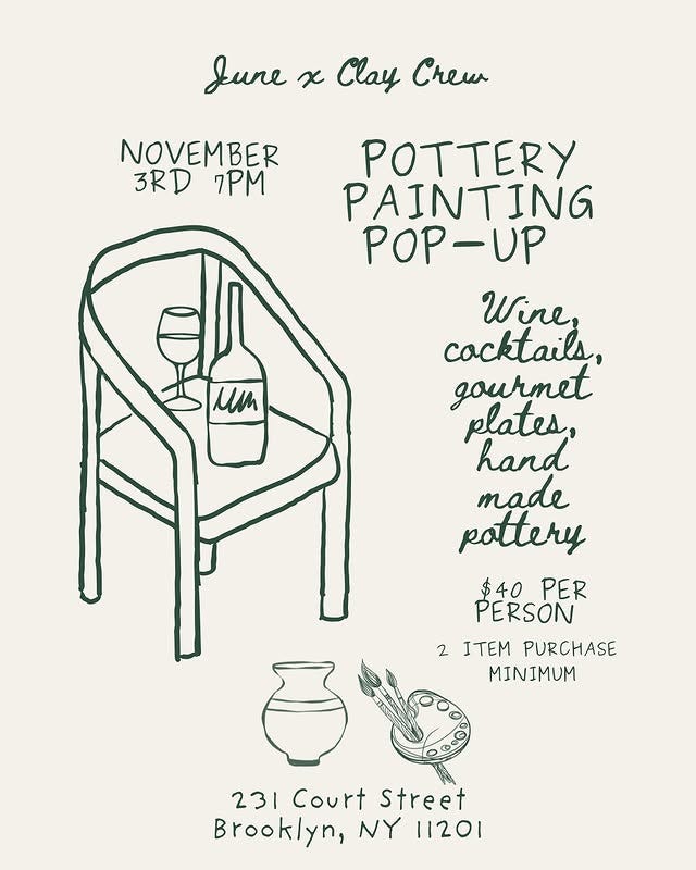 Pottery Painting with Clay Crew @ June Wine Bar (7:00pm)*: Design your own pottery using colorful ceramic underglazes—no experience needed! All materials are provided, and finished pieces will be professionally fired. Enjoy drinks and snacks available for purchase and pick up your handmade creations at June 2–3 weeks later. Tickets ($40) HERE.