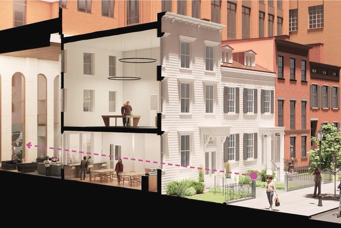 Four 19th-century landmarked townhouses on Duffield Street in Downtown Brooklyn, relocated decades ago, are proposed to be gutted and integrated as a lobby space for a new 33-story tower behind them. Though façades remain protected, the interior removal has raised concern among preservationists. [Curbed]