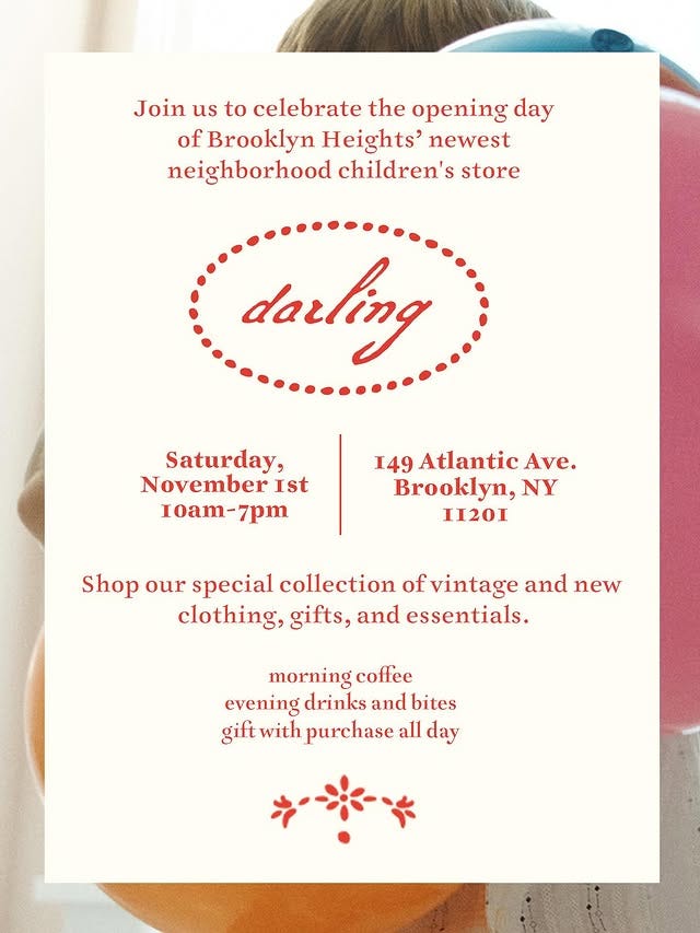 Darling opens Saturday! Celebrate the official opening of Darling Shop NYC at 149 Atlantic Ave. They’ll be celebrating their official opening on Saturday, November 1st.
