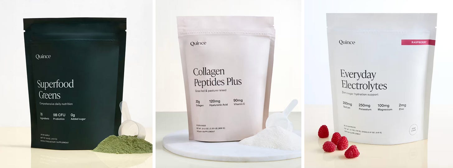 Quince offers a selection of vitamins and supplements designed to fit a variety of dietary preferences. Options include Superfood Greens, Everyday Electrolytes Zero Sugar, and Collagen Peptides Plus. Whether you’re looking for plant-based, sugar-free, or collagen-supporting ingredients, these products make it easy to explore what fits your routine.