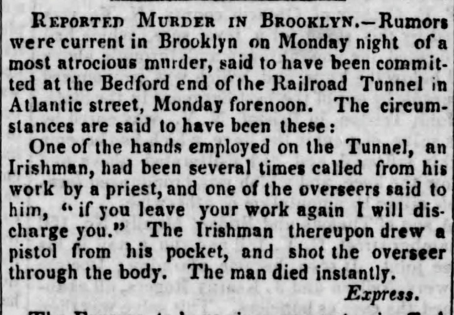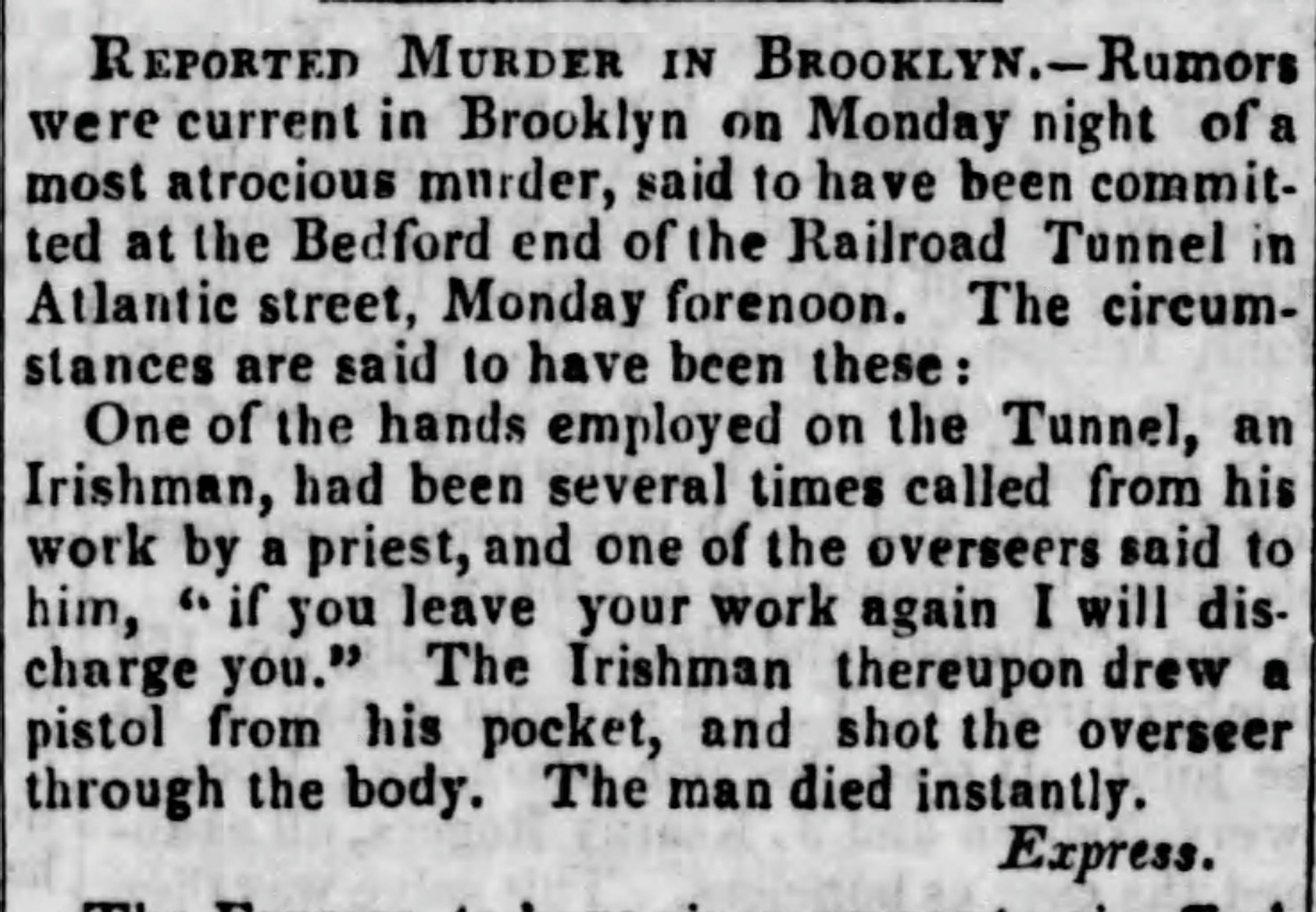 The tunnel took seven months to construct, and crews of mostly Irish and other immigrant workers used hand tools and other rudimentary tools to construct the tunnel. The tunnel was constructed at the cost of some lives. In May, an Irish worker murdered a foreman over a dispute about the workers frequent distraction from his work to visit a priest. The worker drew a gun and shot the foreman in cold blood. Later that year, a man fell from the street level into the trench and workers were buried alive when the tunnel caved in on them.