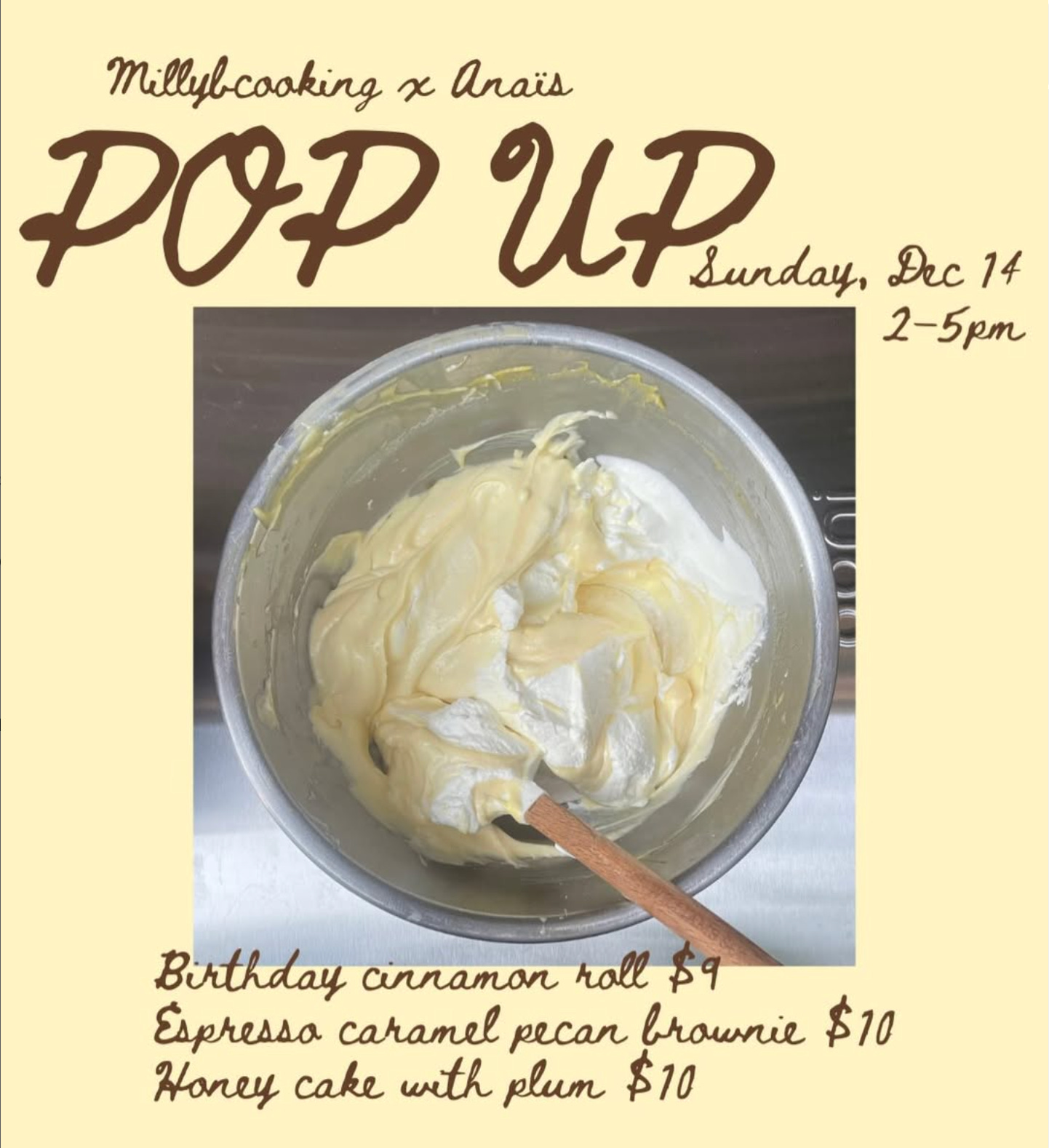 Millybcooking Popup @ Anaïs Wine Bar (2:00pm-5:00pm): Check out this dreamy dessert lineup, including a birthday cinnamon roll, espresso caramel pecan brownie, and honey cake with plum. Swing by to treat yourself to something sweet and seasonal.