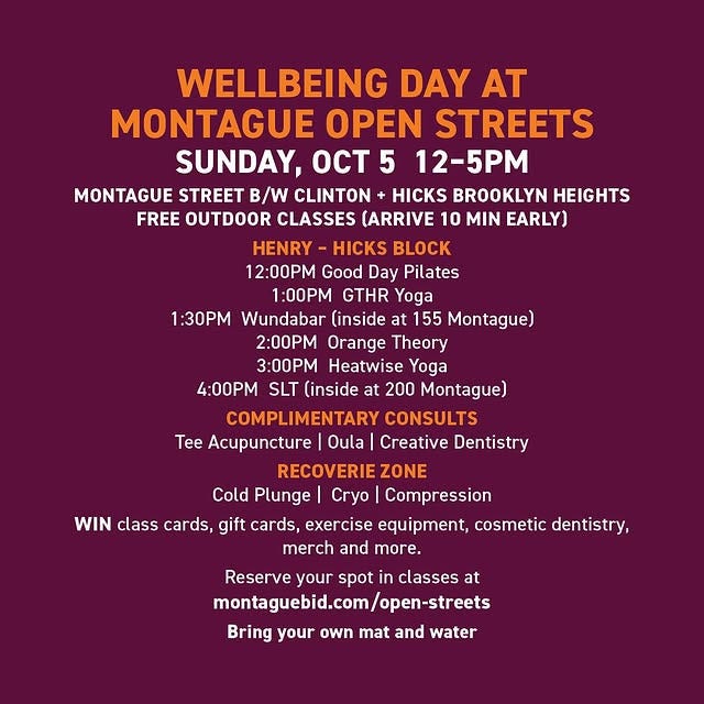 Wellbeing Day @ Montague Open Streets (12:00pm-5:00pm): It’s Wellbeing Day at Montague Open Streets! Find free outdoor fitness classes, wellness consults, recovery sessions, and giveaways from local favorites. It’s the perfect chance to move, recharge.