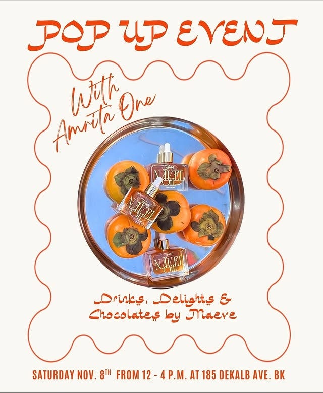 Pop-up with Amrtia One @ Su’juk Fort Greene (12:00pm-4:00pm): Meet Chandni, the maker behind Amrita One’s nourishing navel oil, and enjoy vintage finds, bon bons by Maeve Chocolate, and refreshing sips while you shop.