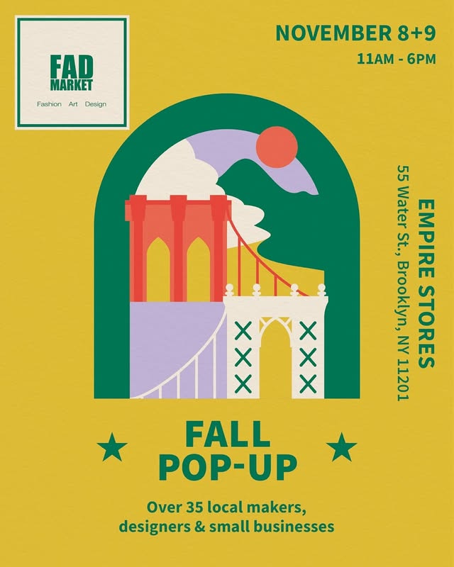 FAD Market @ Empire Stores DUMBO (November 8-9, 11:00am-6:00pm): The market is back in DUMBO! Shop 35+ all-new makers and artists at their Fall Pop-up, come for the handmade finds and stay for the views.
