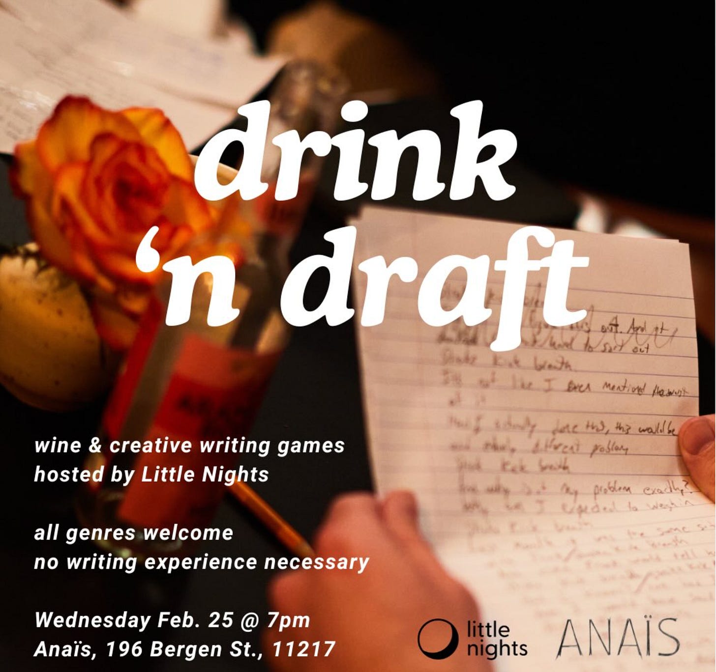 Drink n’ Draft @ Anaïs Wine Bar (7:00pm): Enjoy a cozy night of wine and creative writing games. All genres and experience levels are welcome.